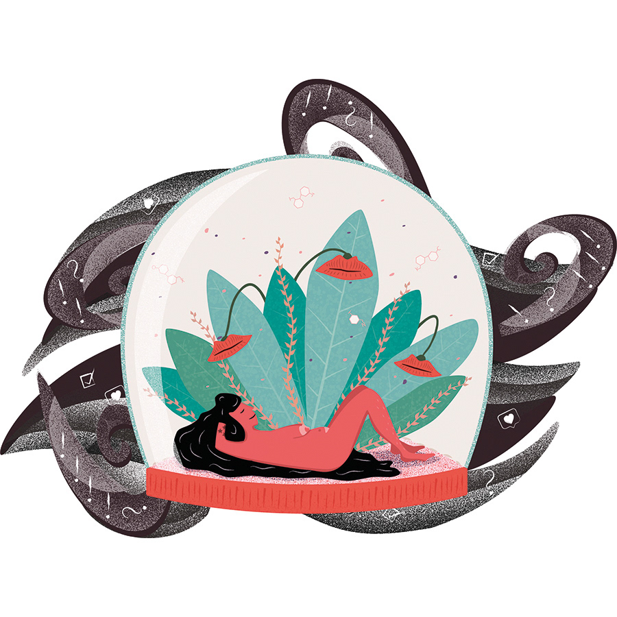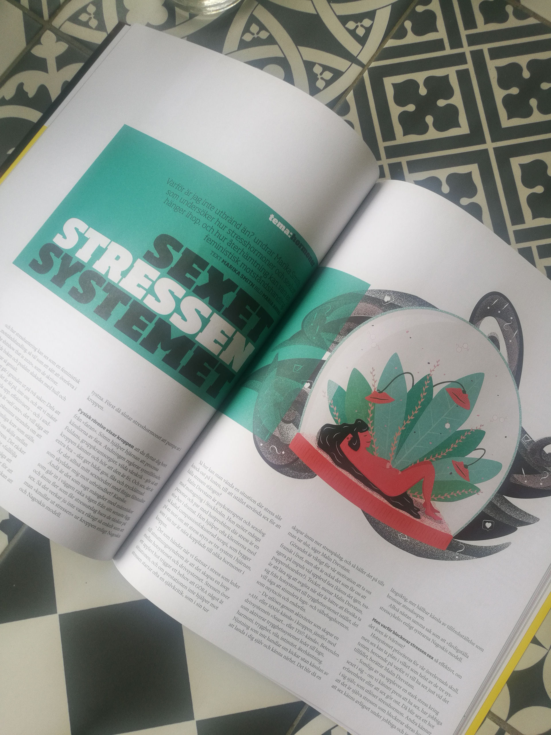 Illustration samt infografik till artikel om hur stresshormoner påverkar lusten i RFSUs tidsskrift Ottar.